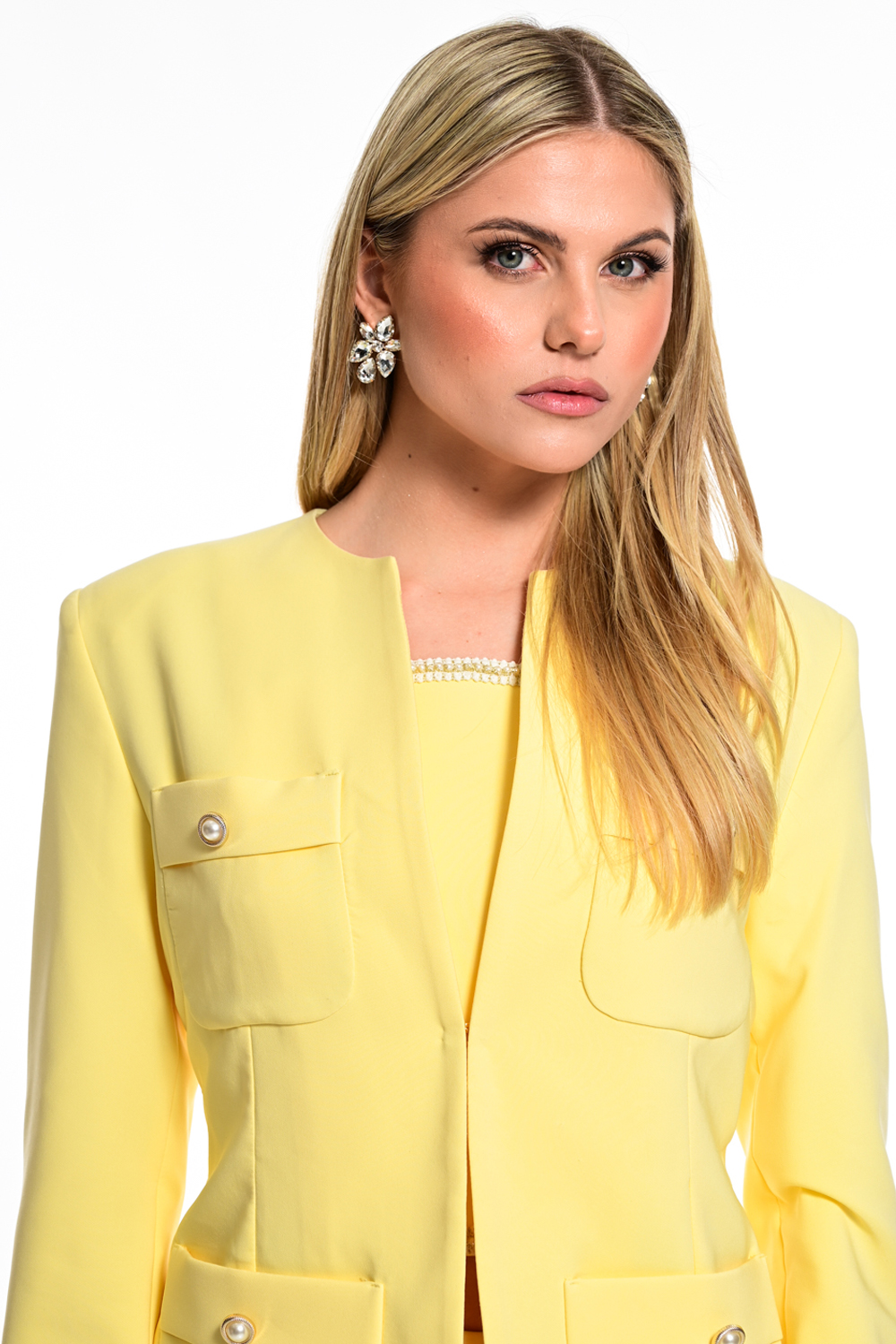 Κομψό γυναικείο σακάκι με minimal σχεδιασμό και μοντέρνα γραμμή που αγκαλιάζει τη σιλουέτα. Διαθέτει διακοσμητικές τσέπες με κουμπιά και καθαρές γραμμές που το κάνουν ιδανικό τόσο για καθημερινά όσο και για πιο elegant σύνολα. Φοριέται εύκολα με φορέματα, φούστες ή παντελόνια, δημιουργώντας ένα σύγχρονο και sophisticated look.