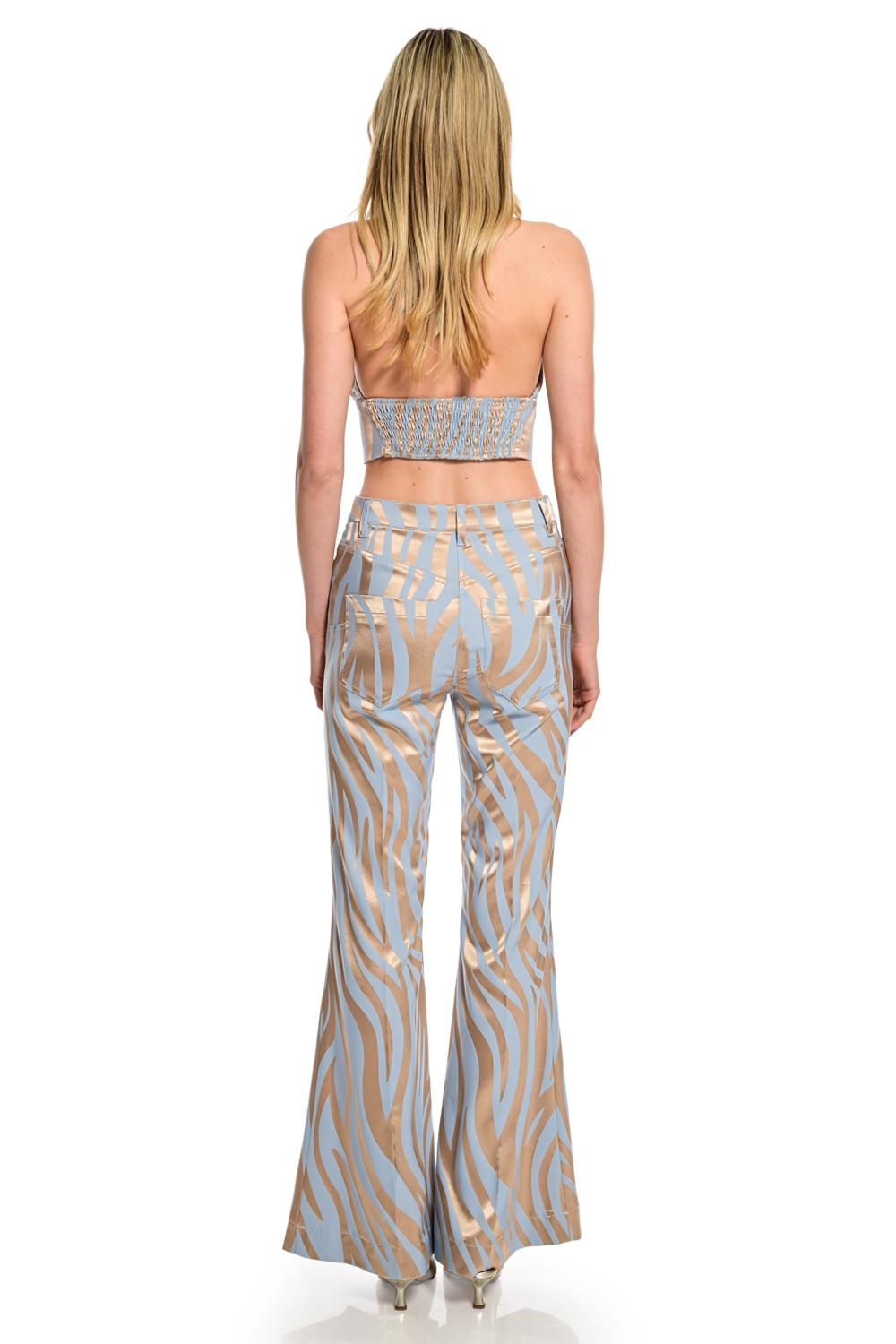 Εντυπωσιακό γυναικείο παντελόνι με zebra-inspired print σε συνδυασμό γαλάζιων και χρυσών τόνων που αποπνέει δυναμικό και fashion-forward χαρακτήρα. Διαθέτει εφαρμοστή γραμμή στο επάνω μέρος και flare τελείωμα που επιμηκύνει τη σιλουέτα, ενώ η μεταλλική υφή προσθέτει λάμψη και πολυτέλεια. Ιδανικό για ξεχωριστές εμφανίσεις, συνδυάζεται άψογα με το matching top για ένα ολοκληρωμένο και statement look.