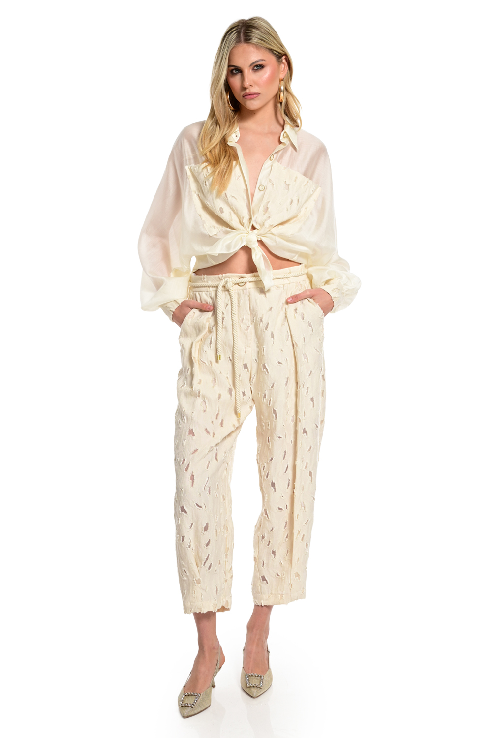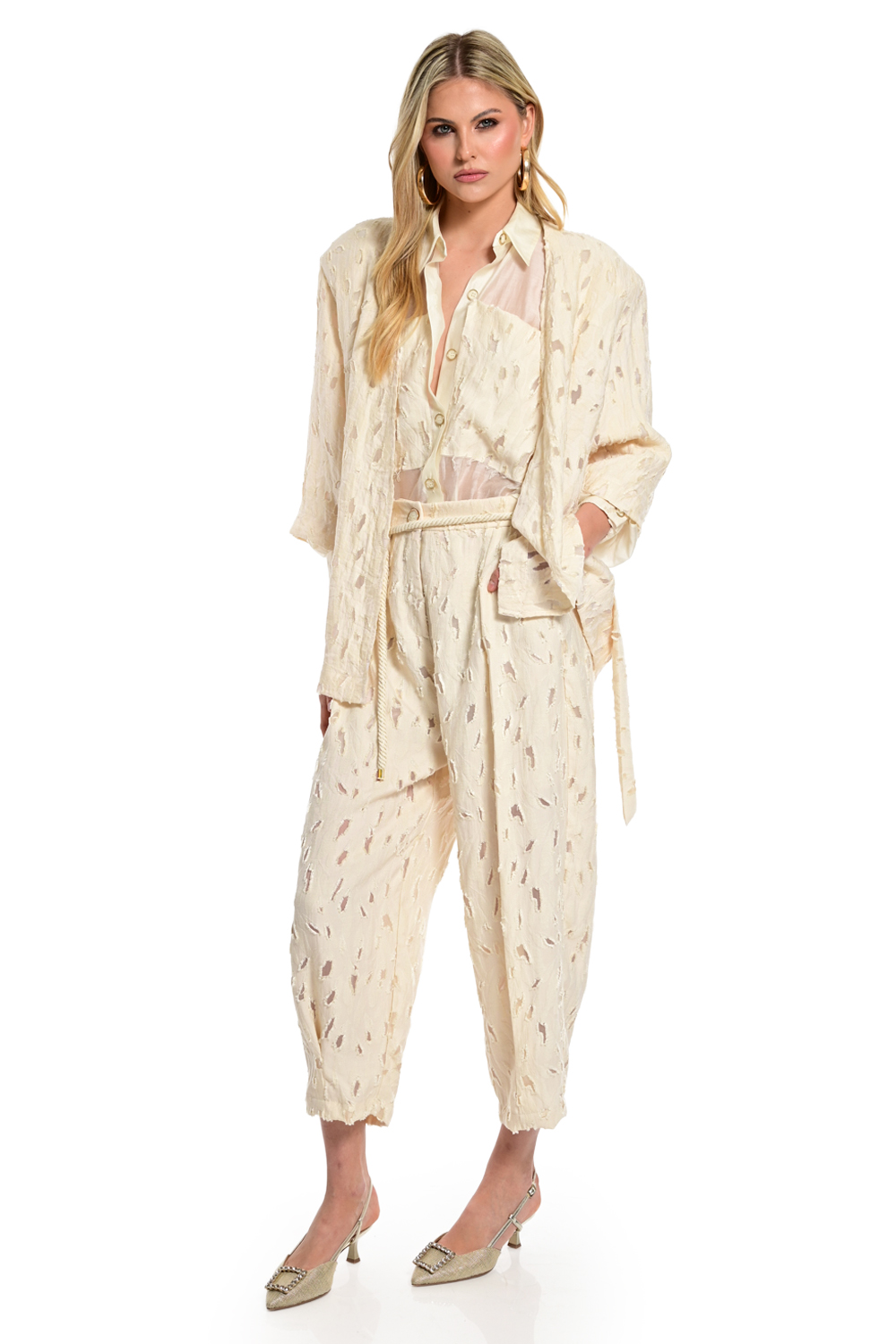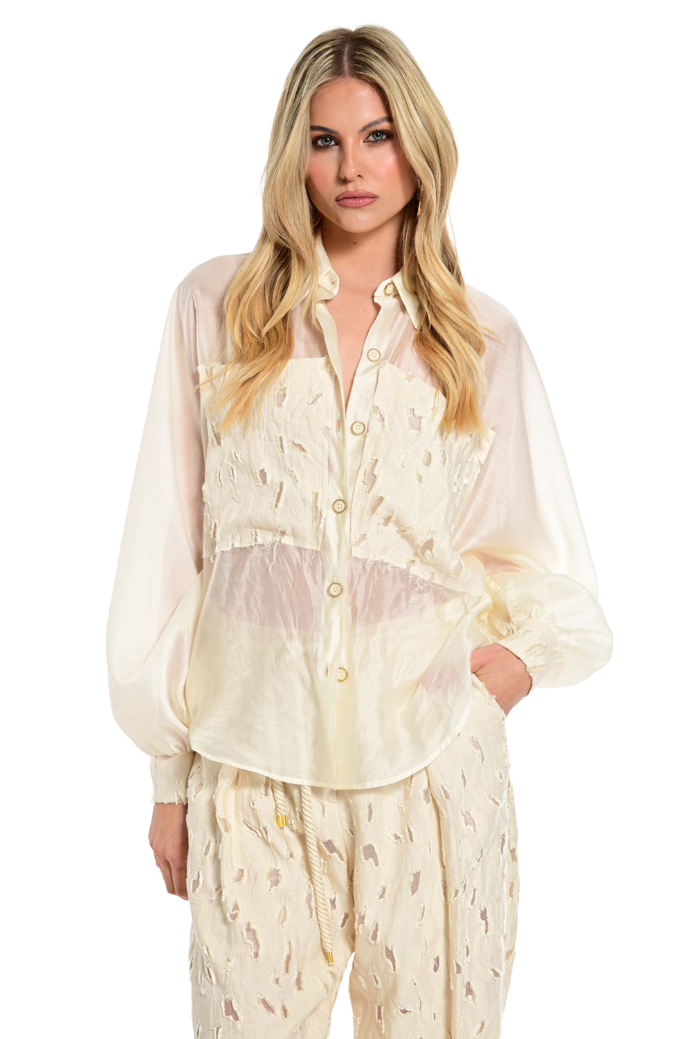 Αέρινο πουκάμισο σε εκρού/ivory απόχρωση με ημιδιάφανη υφή που αποπνέει κομψότητα και φυσική θηλυκότητα. Διαθέτει κλασικό γιακά, κουμπιά μπροστά και μακριά μανίκια με χαλαρή εφαρμογή, ενώ οι ανάγλυφες λεπτομέρειες στο μπροστινό μέρος προσθέτουν ιδιαίτερο χαρακτήρα. Ιδανικό για layering και casual chic εμφανίσεις, συνδυάζεται άψογα με το αντίστοιχο παντελόνι για ένα ολοκληρωμένο και σύγχρονο σύνολο.