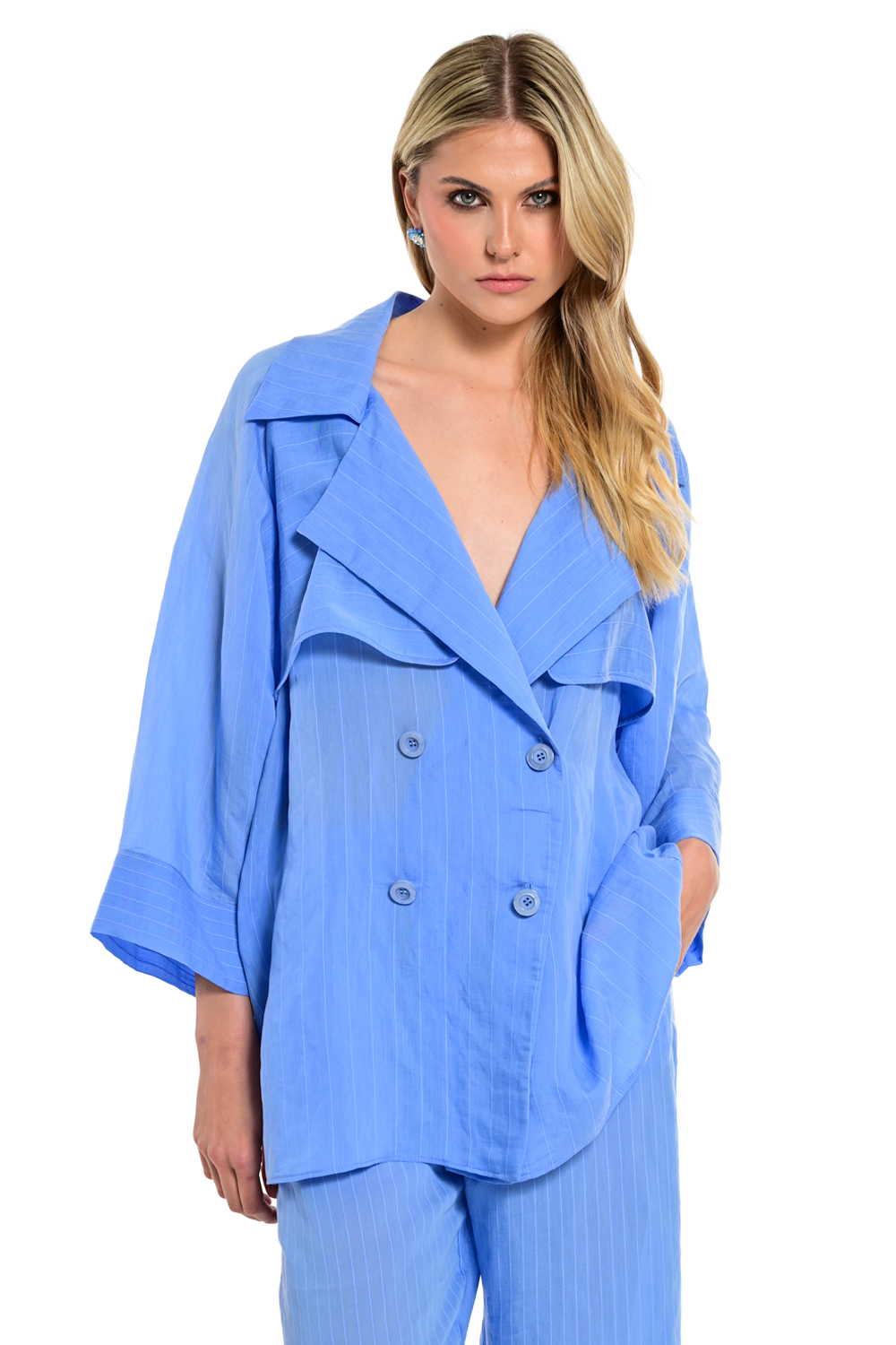 Αέρινο πουκάμισο σε γαλάζια απόχρωση με κομψή, χαλαρή γραμμή που αποπνέει φρεσκάδα και μοντέρνα αισθητική. Διαθέτει γιακά με έντονη σχεδιαστική γραμμή, μανίκια 3/4 και ζώνη στη μέση που αναδεικνύει τη σιλουέτα προσφέροντας ταυτόχρονα άνεση. Ιδανικό για chic καθημερινές εμφανίσεις αλλά και πιο elevated looks, συνδυάζεται άψογα με το αντίστοιχο παντελόνι για ένα ολοκληρωμένο σύνολο.