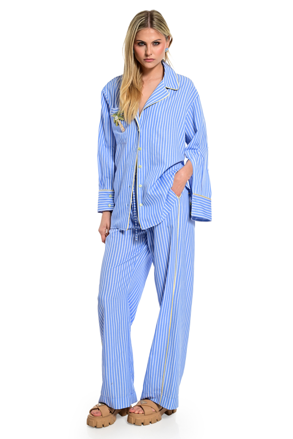 Άνετο παντελόνι σε γαλάζια απόχρωση με διαχρονικές κάθετες ρίγες που χαρίζουν κομψότητα και στιλ. Διαθέτει ελαστική μέση με κορδόνι για τέλεια εφαρμογή και χαλαρή γραμμή που προσφέρει άνεση και κίνηση. Ιδανικό για casual αλλά και πιο προσεγμένες εμφανίσεις, συνδυάζεται άψογα με το αντίστοιχο πουκάμισο για ένα ολοκληρωμένο, μοντέρνο σύνολο.
