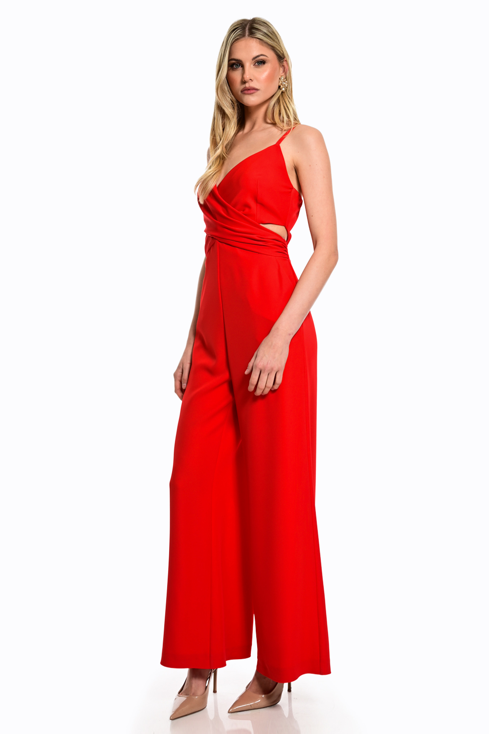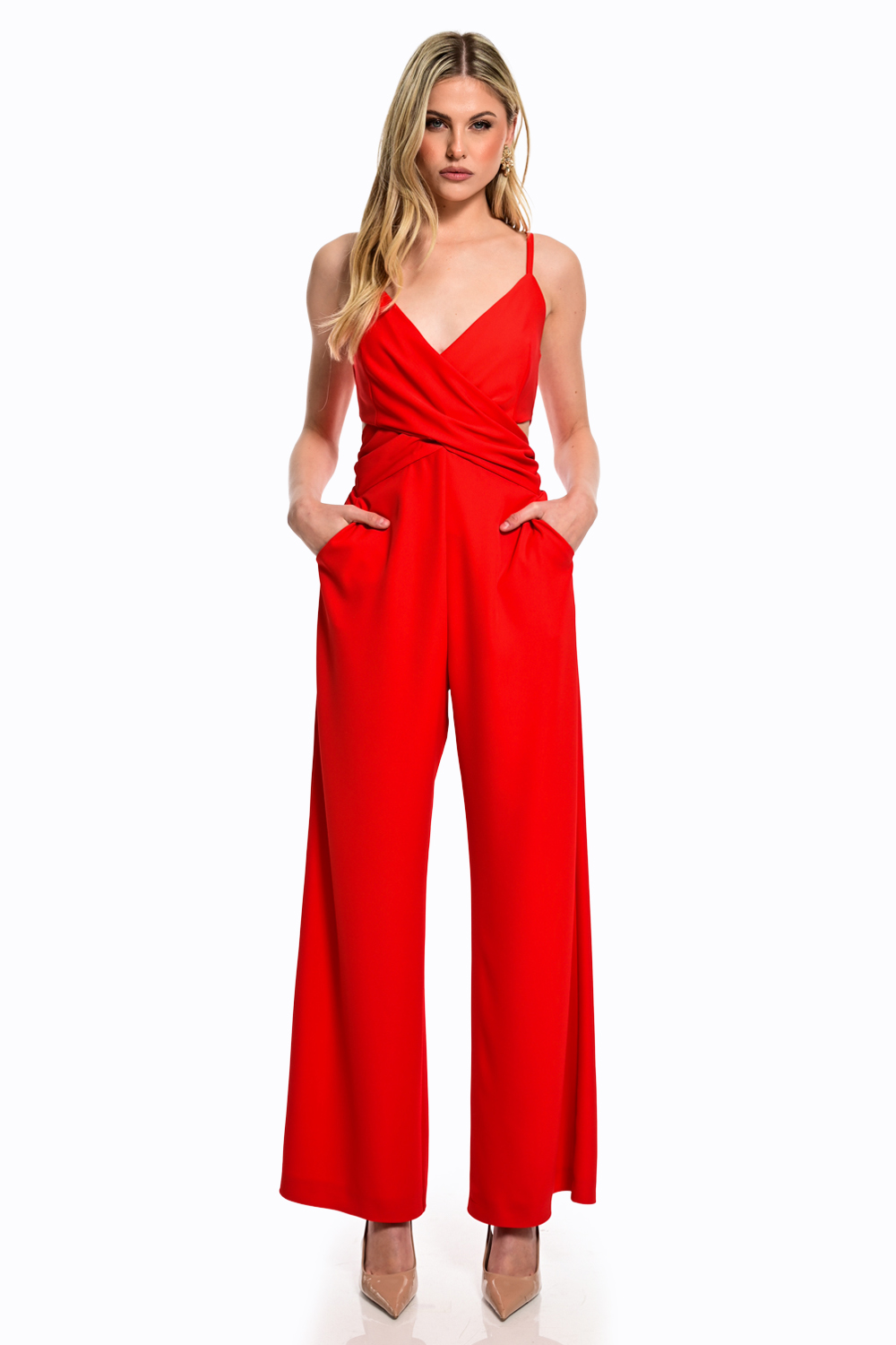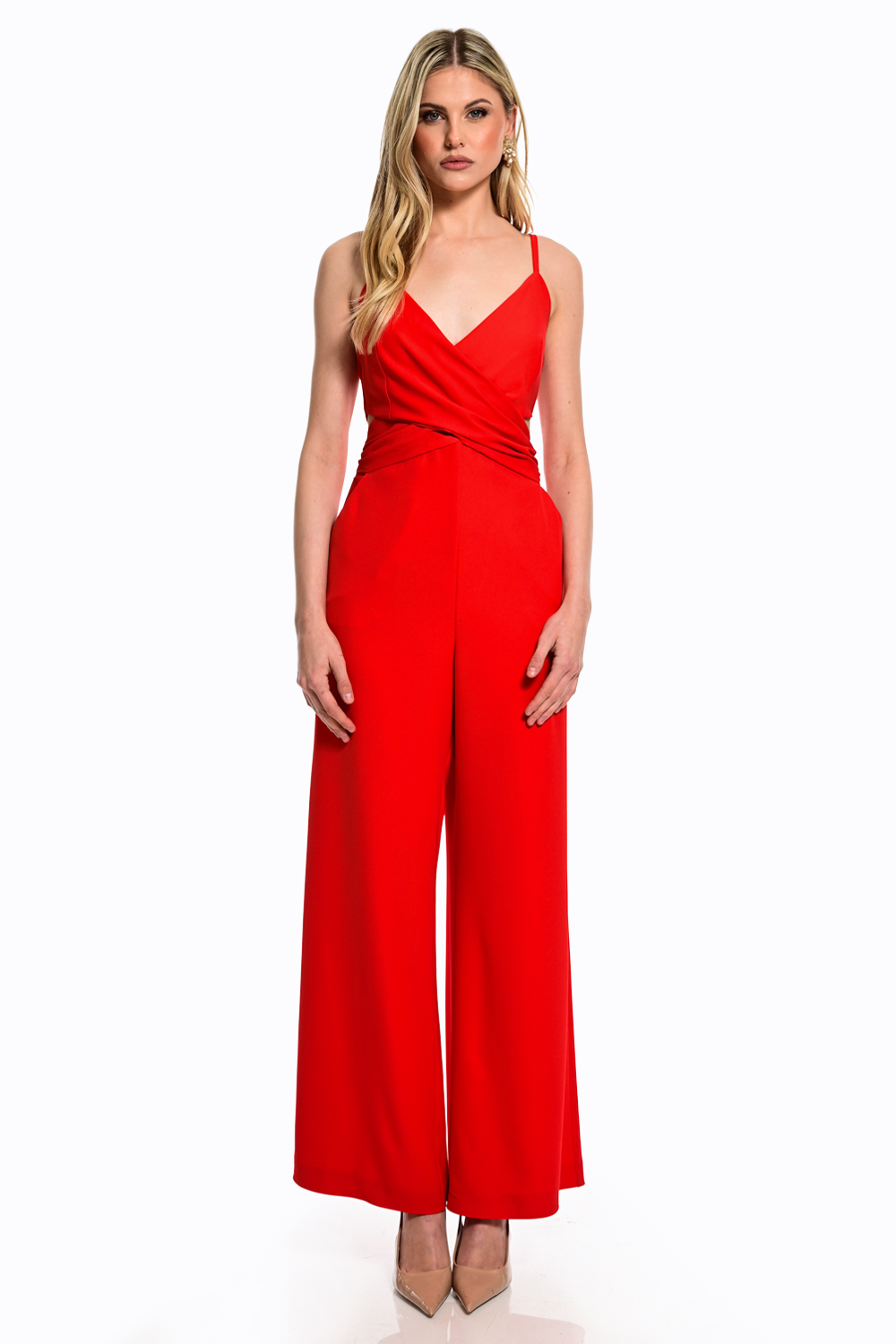 Εντυπωσιακή ολόσωμη φόρμα σε έντονη κόκκινη απόχρωση που αποπνέει δυναμισμό και κομψότητα. Το κρουαζέ μπούστο με λεπτές τιράντες αναδεικνύει το ντεκολτέ, ενώ η εφαρμογή στη μέση τονίζει τη σιλουέτα. Η wide-leg γραμμή προσφέρει αέρινη κίνηση και sophisticated ύφος, ιδανικό για βραδινές εμφανίσεις ή ιδιαίτερες περιστάσεις.