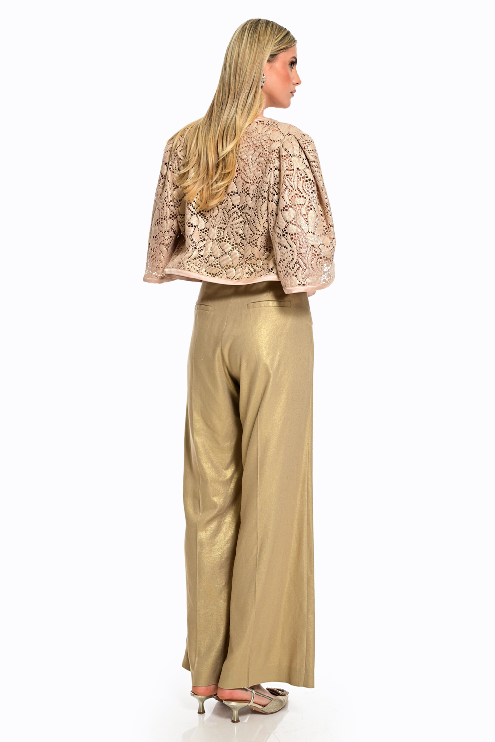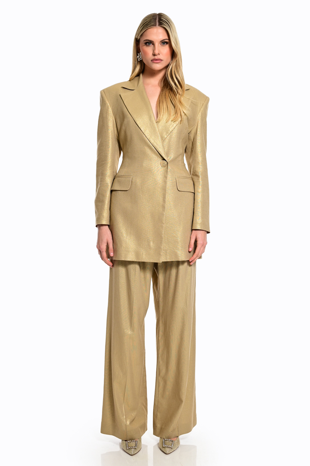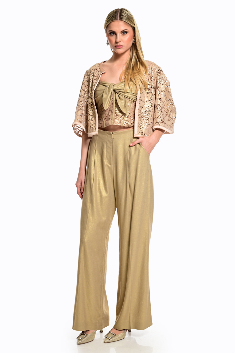 Εντυπωσιακό παντελόνι σε χρυσή απόχρωση με διακριτική λάμψη που χαρίζει πολυτελή αισθητική σε κάθε εμφάνιση. Η ψηλόμεση γραμμή και η άνετη, ίσια εφαρμογή αναδεικνύουν τη σιλουέτα, ενώ το ανάλαφρο ύφασμα προσφέρει κομψή κίνηση. Ιδανικό για βραδινά looks ή ιδιαίτερες περιστάσεις, συνδυάζεται τέλεια με statement tops για ένα sophisticated αποτέλεσμα.