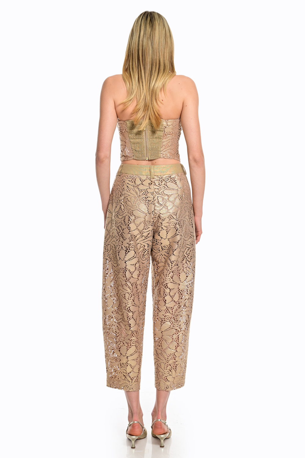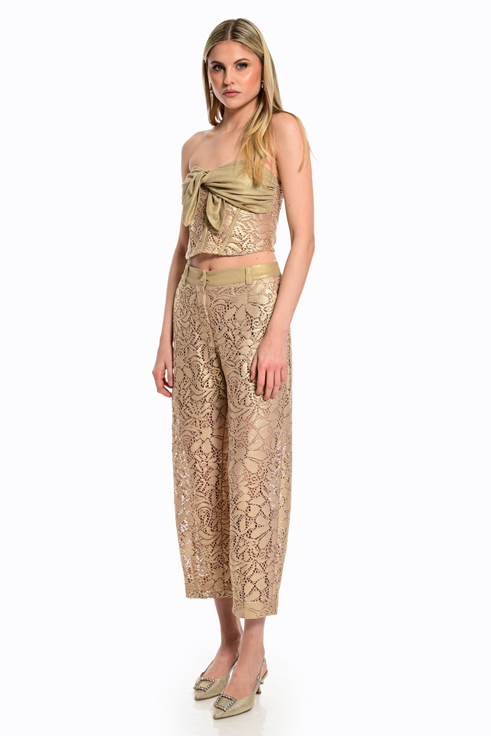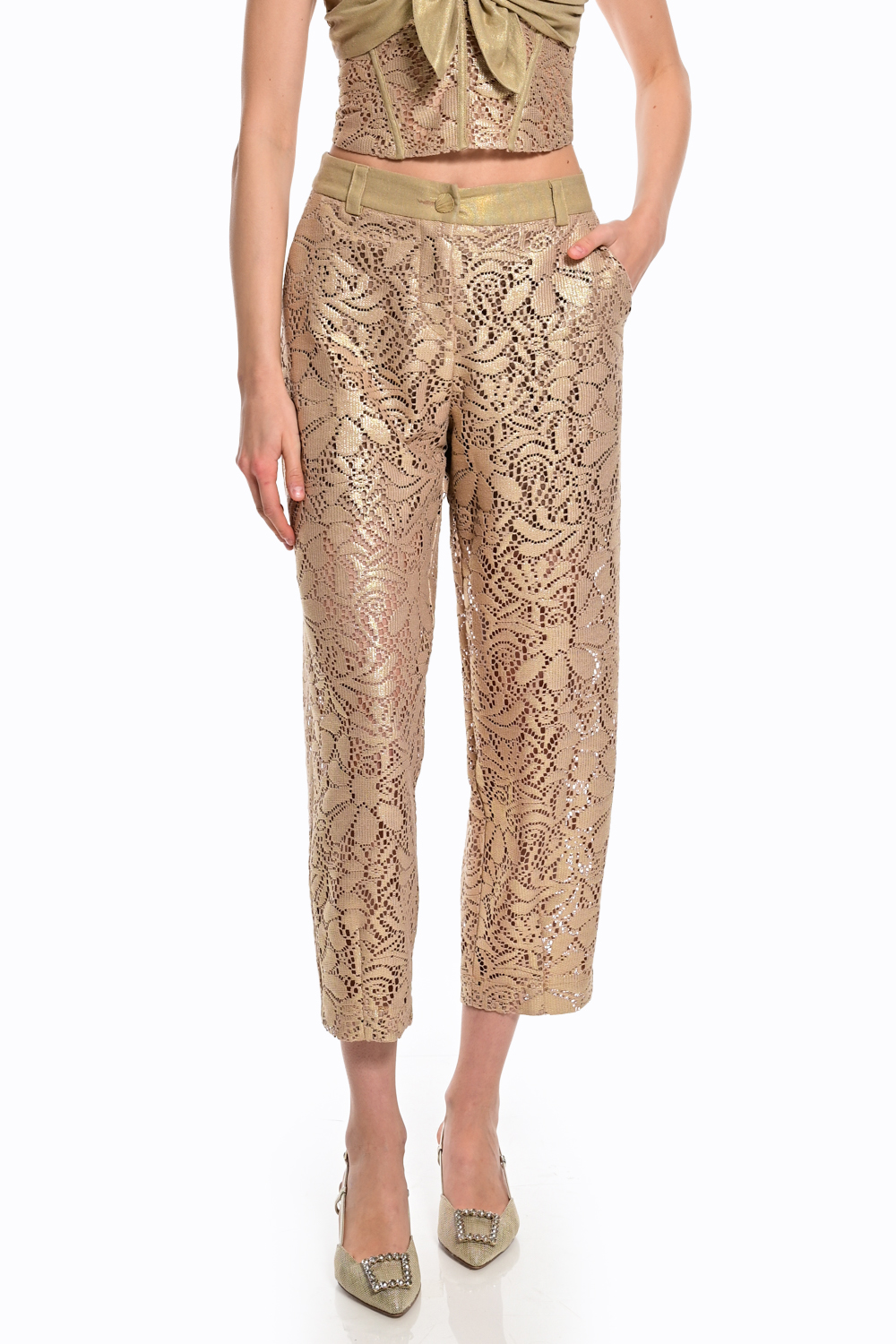Κομψό γυναικείο παντελόνι με δαντελένιο σχέδιο σε χρυσή απόχρωση που αποπνέει πολυτέλεια και θηλυκότητα. Διαθέτει cropped μήκος και καθαρή γραμμή που αγκαλιάζει τη σιλουέτα, ενώ η υφή της δαντέλας προσθέτει μία ιδιαίτερη και elegant πινελιά. Ιδανικό για βραδινές εμφανίσεις ή ξεχωριστές περιστάσεις, συνδυάζεται τέλεια με το matching top για ένα εντυπωσιακό σύνολο.