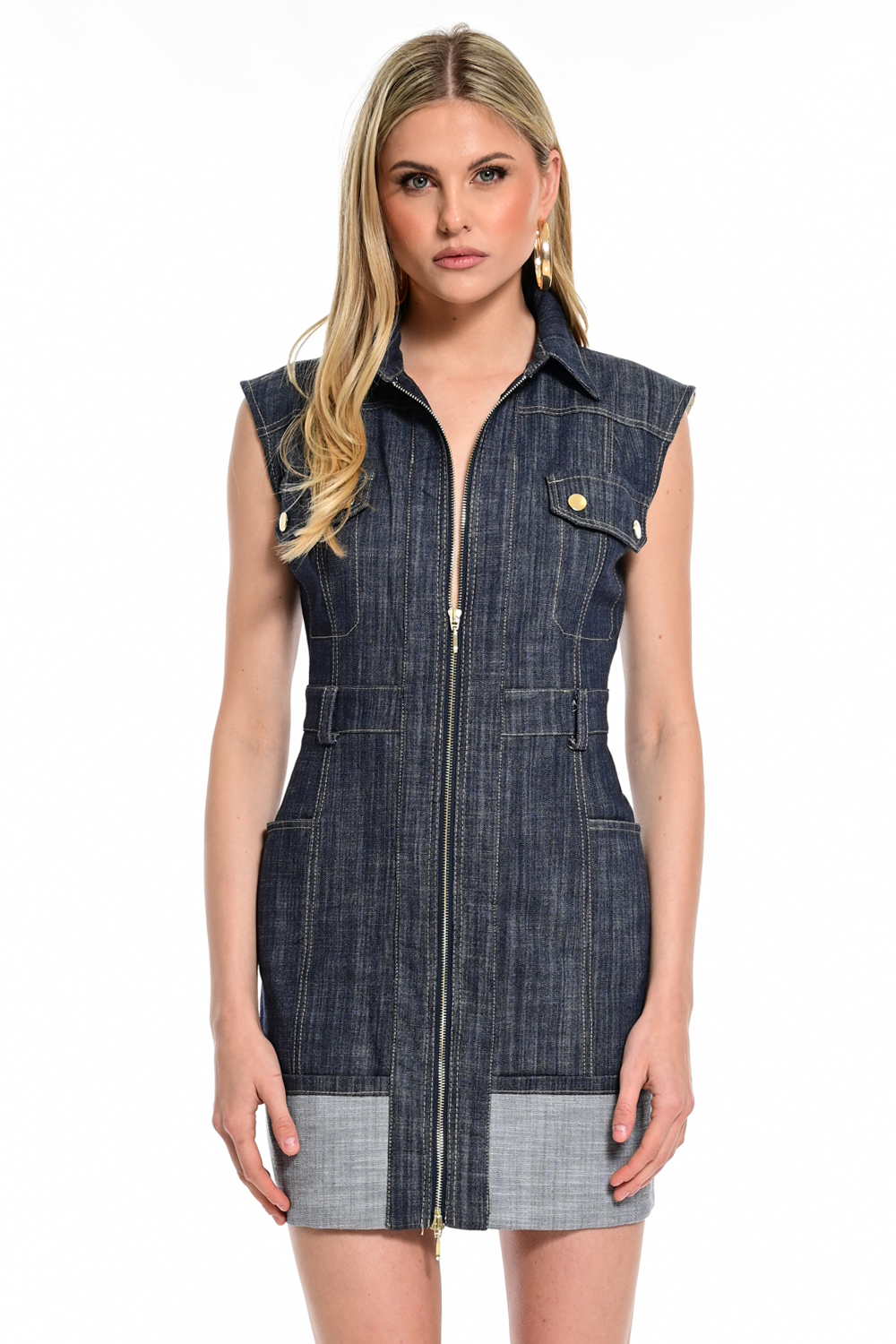 Μοντέρνο mini τζιν φόρεμα σε ίσια γραμμή, με μπροστινό μεταλλικό φερμουάρ που προσθέτει δυναμικό χαρακτήρα. Διαθέτει γιακά, διακοσμητικές τσέπες και εμφανείς ραφές που αναδεικνύουν το denim ύφος.
