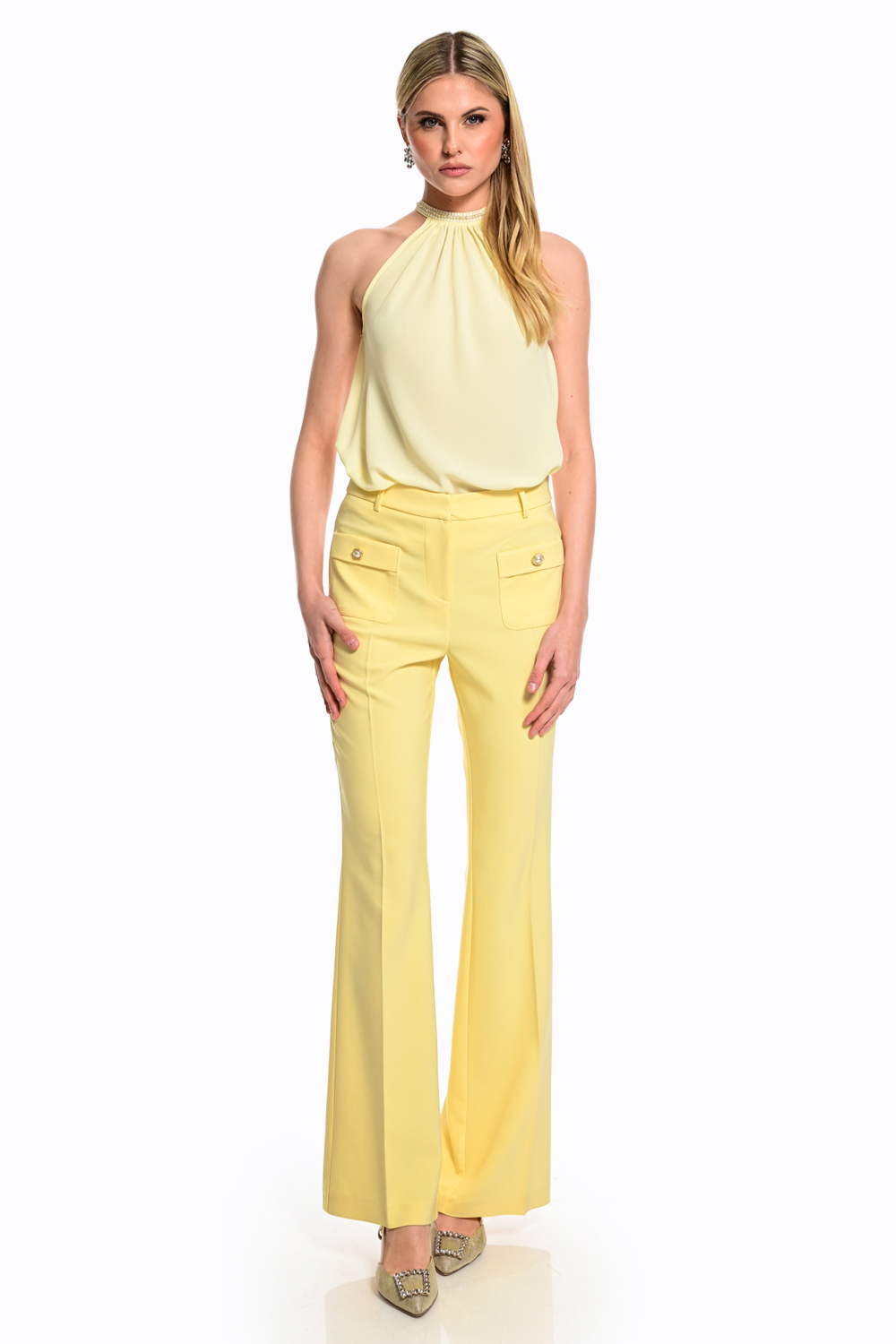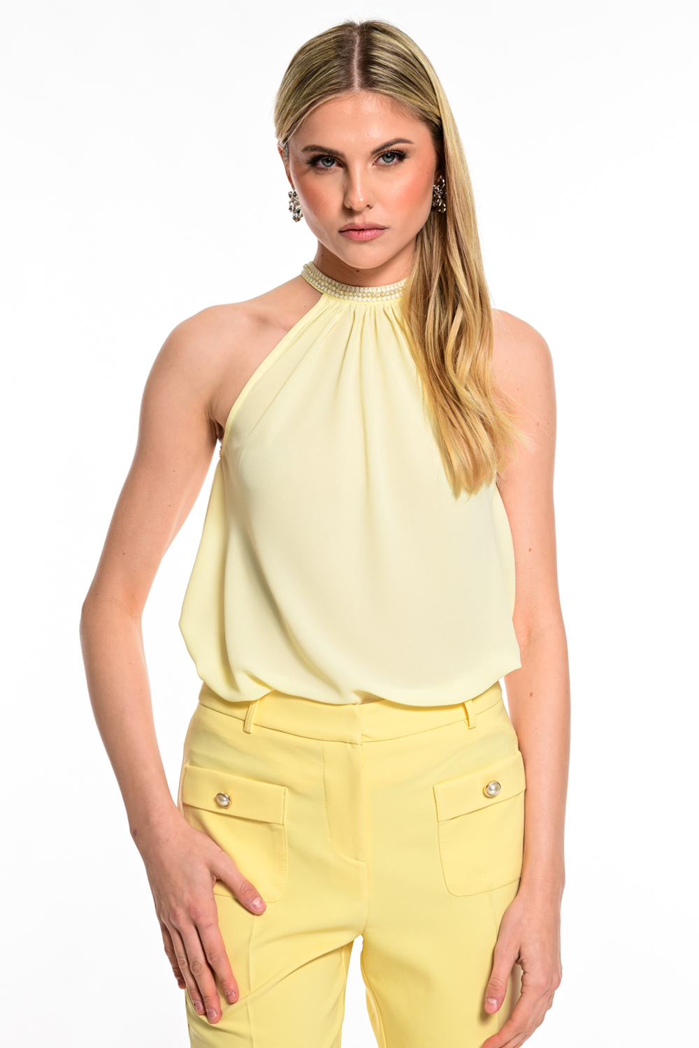 Αέρινη μπλούζα σε απαλή κίτρινη απόχρωση που αποπνέει φρεσκάδα και κομψότητα. Το halter σχέδιο με διακριτική διακόσμηση στον λαιμό χαρίζει elegant χαρακτήρα, ενώ η χαλαρή γραμμή αγκαλιάζει το σώμα με φυσική κίνηση. Ιδανική για καλοκαιρινές εμφανίσεις, συνδυάζεται εύκολα με tailored παντελόνια ή φούστες για ένα refined και φωτεινό look.