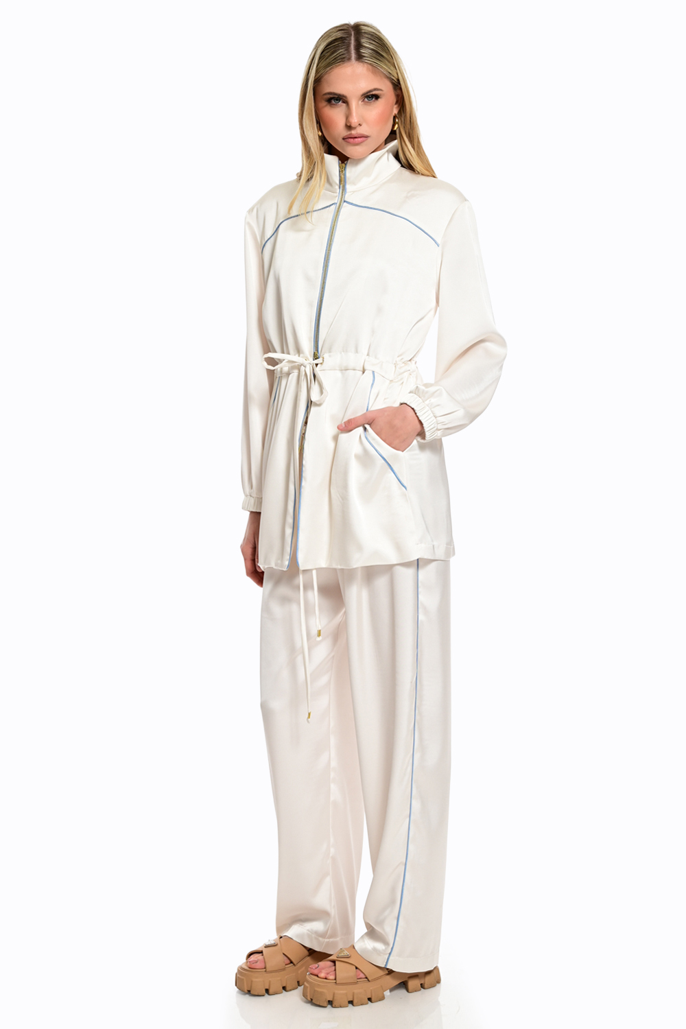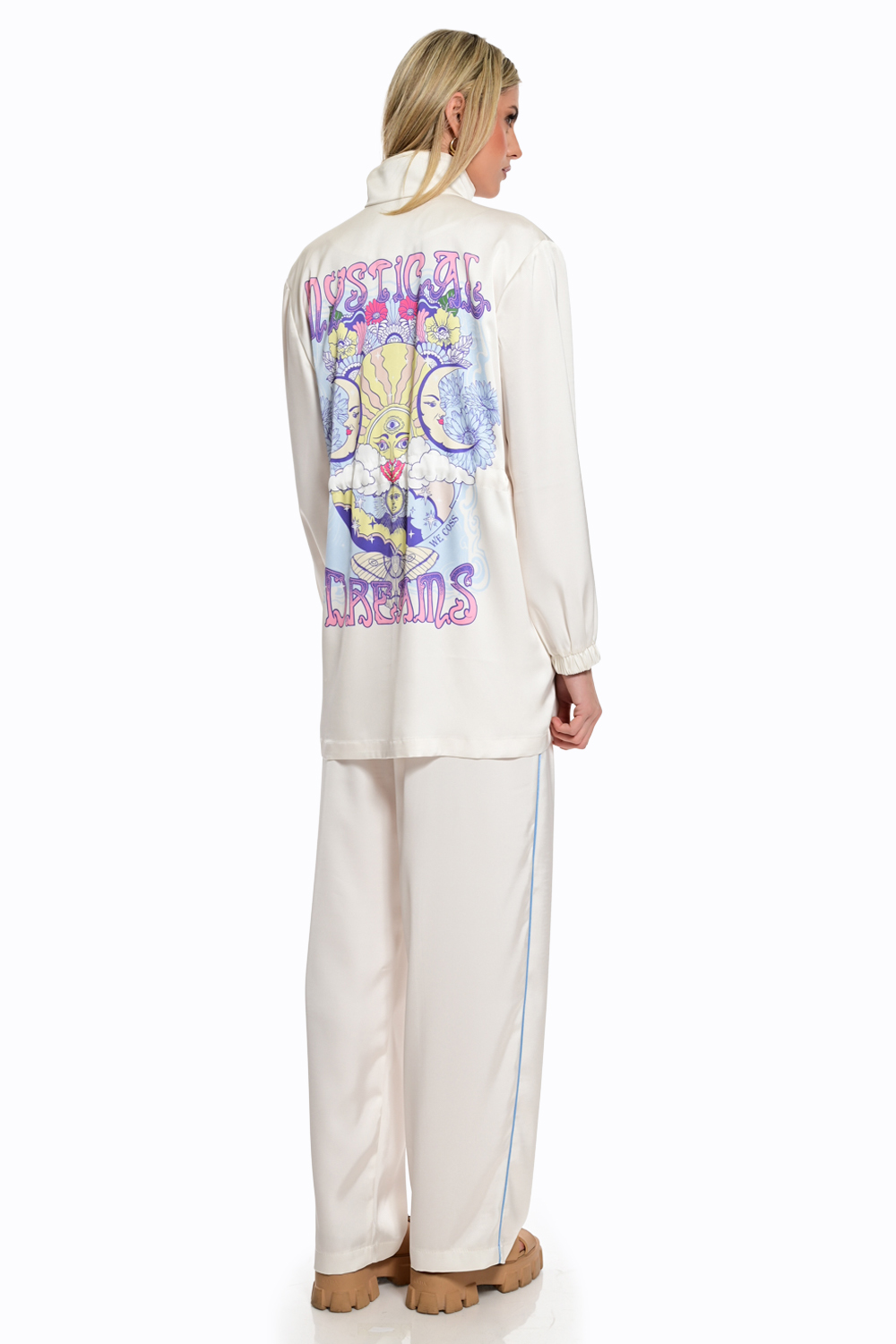 Εντυπωσιακό σακάκι σε χαλαρή γραμμή με minimal μπροστινή όψη και statement print στην πλάτη που κλέβει τις εντυπώσεις. Το καλλιτεχνικό “Mystical Dreams” σχέδιο συνδυάζει συμβολικά στοιχεία και παστέλ αποχρώσεις, δημιουργώντας ένα μοναδικό fashion piece. Διαθέτει φερμουάρ, λάστιχο στη μέση για καλύτερη εφαρμογή και μοντέρνα sport-chic αισθητική. Ιδανικό για ξεχωριστές εμφανίσεις που θέλουν να κάνουν statement.