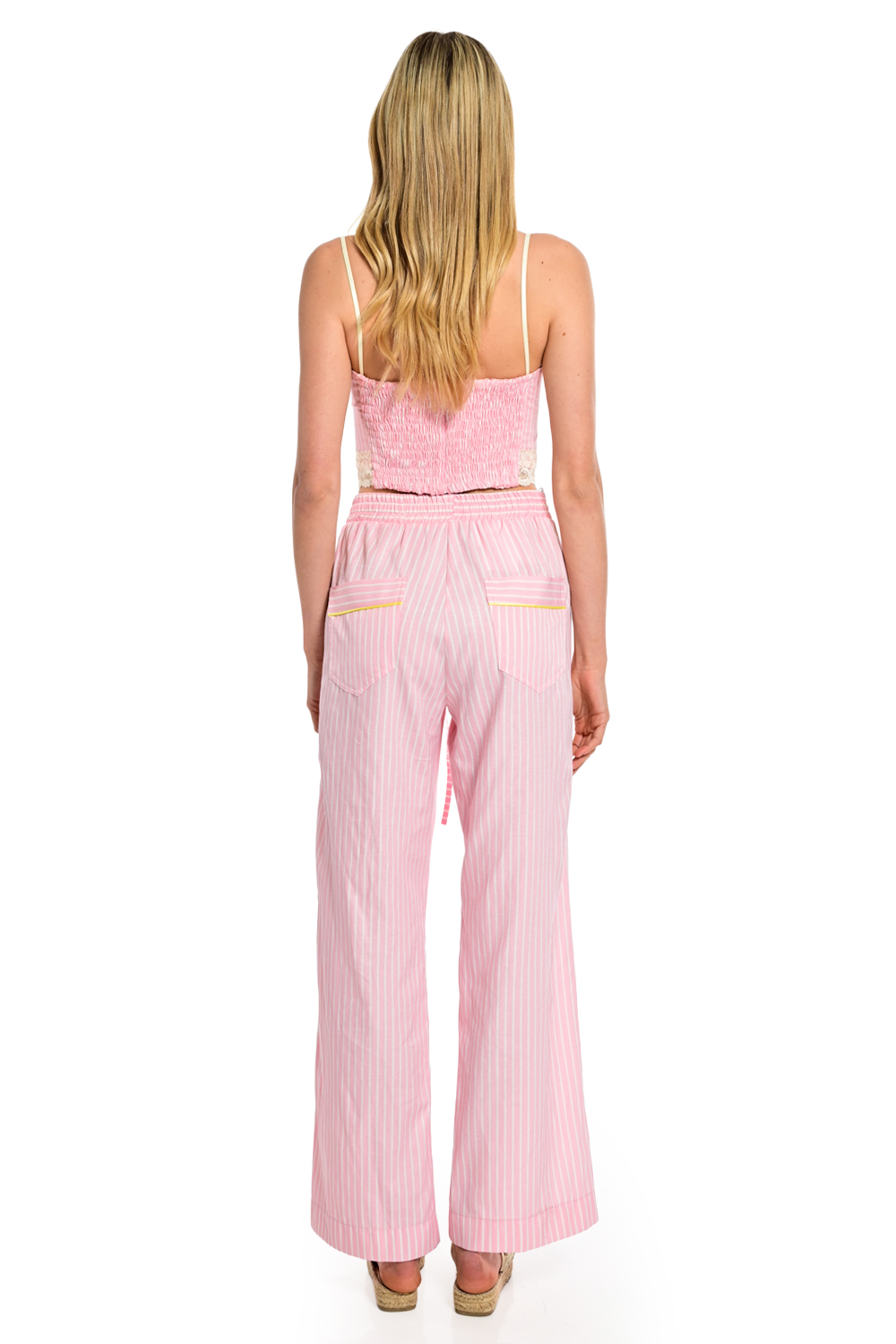 Θηλυκό bustier σε ροζ απόχρωση με λεπτές ρίγες και ρομαντική διάθεση. Αγκαλιάζει το σώμα αναδεικνύοντας τη σιλουέτα, ενώ οι διακριτικές λεπτομέρειες προσθέτουν κομψότητα. Ιδανικό για καλοκαιρινά looks, φοριέται τέλεια σε σετ με το αντίστοιχο πουκάμισο και παντελόνι.
