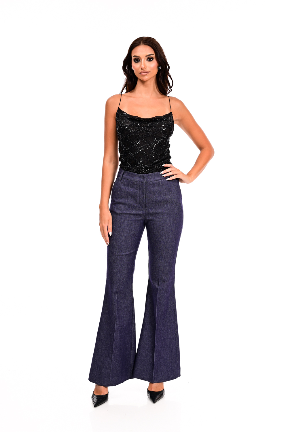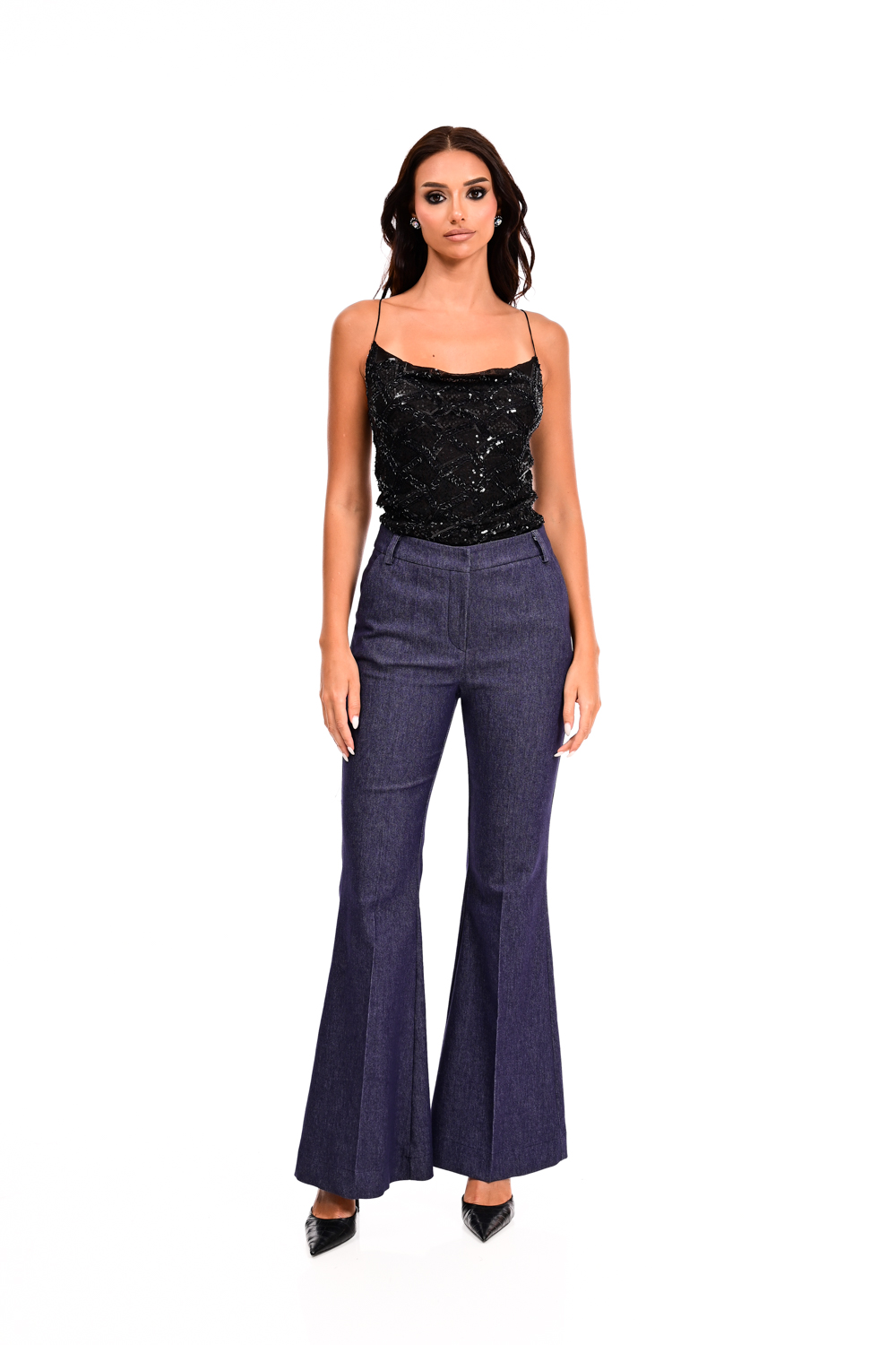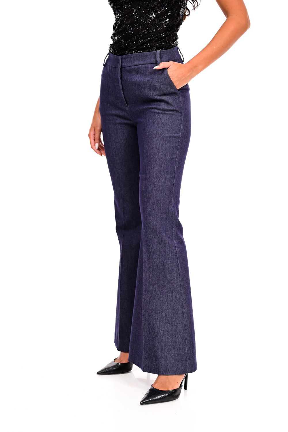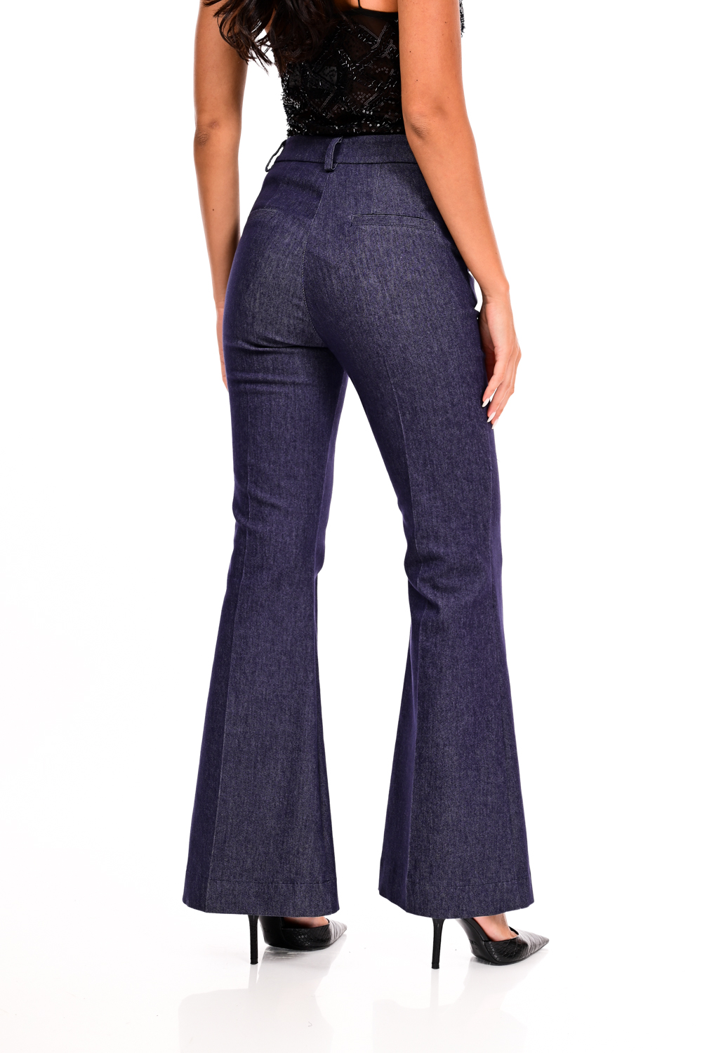 Κομψό τζιν παντελόνι καμπάνα γραμμή που χαρίζει ύψος και σμιλεύει τη σιλουέτα. Διαθέτει ψηλή μέση και κλασικό κλείσιμο με κουμπί και φερμουάρ, ενώ το ελαφρώς ελαστικό ύφασμα προσφέρει άνεση στην κίνηση. Ένα διαχρονικό κομμάτι που μπορεί να φορεθεί από το πρωί στο γραφείο μέχρι και σε βραδινές εμφανίσεις, ανάλογα με τα αξεσουάρ και τα παπούτσια που θα το συνδυάσετε.