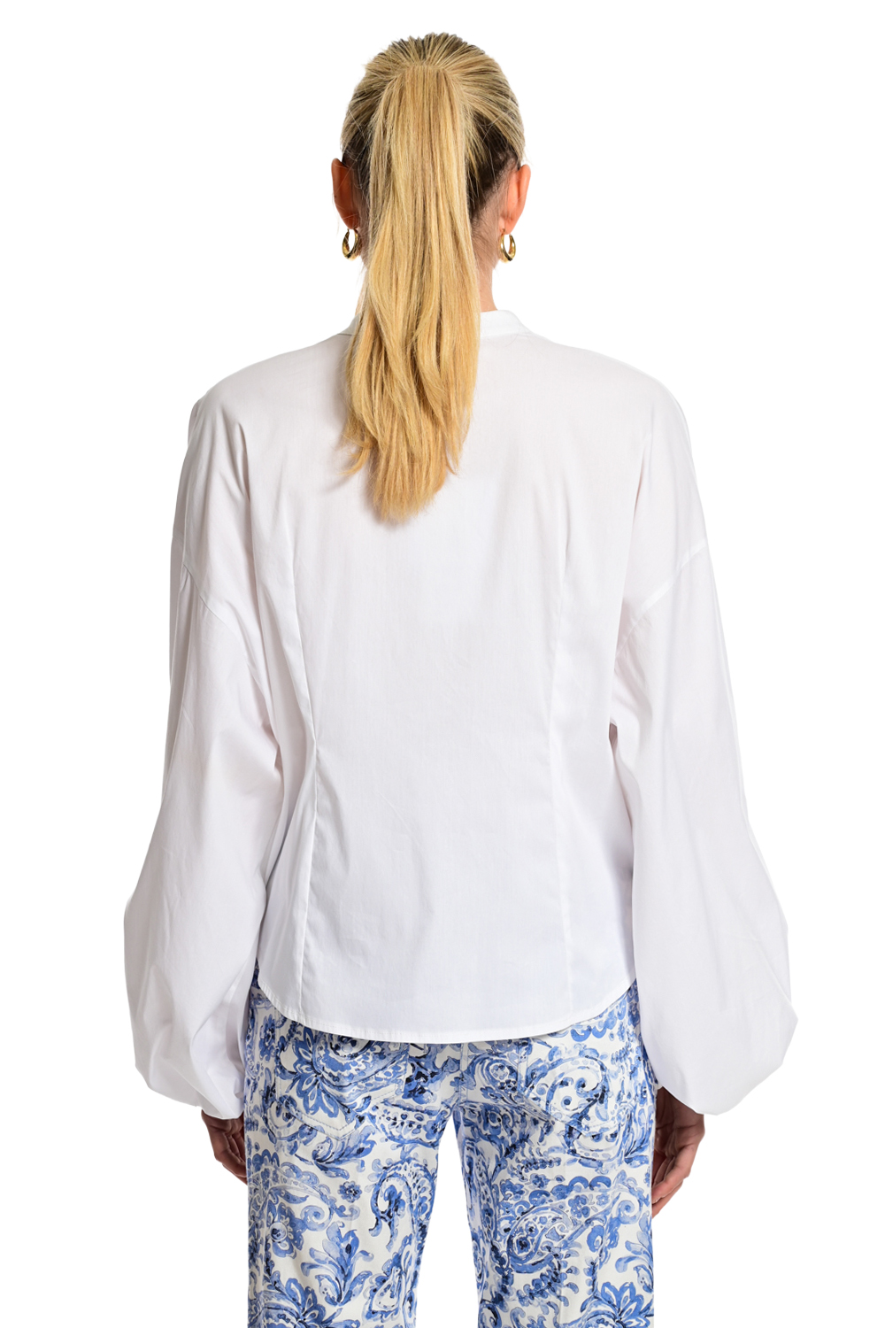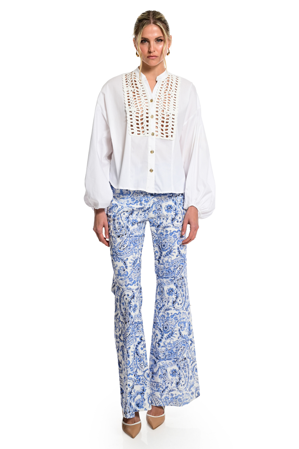 Κομψό πουκάμισο σε λευκή απόχρωση με εντυπωσιακή crochet λεπτομέρεια στο μπροστινό μέρος που χαρίζει ρομαντικό και φίνο χαρακτήρα. Διαθέτει χαλαρή γραμμή και μανίκια με όγκο για άνεση και κομψότητα. Ιδανικό για chic εμφανίσεις, συνδυάζεται εύκολα τόσο με statement κομμάτια όσο και με πιο minimal σύνολα.