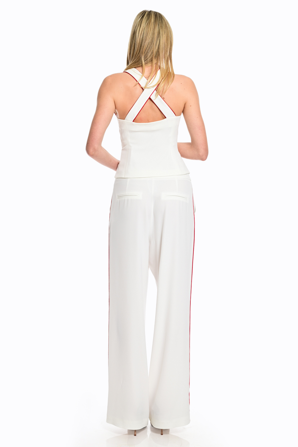 Κομψή λευκή παντελόνα σε ίσια, άνετη γραμμή με διακριτική κόκκινη ρίγα στο πλάι που χαρίζει μοντέρνο χαρακτήρα. Η ψηλόμεση εφαρμογή αγκαλιάζει σωστά τη μέση και δημιουργεί κομψή, επιμηκυμένη σιλουέτα.