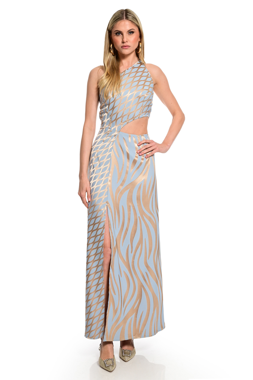 Εντυπωσιακό maxi φόρεμα σε γαλάζια βάση με χρυσά abstract μοτίβα που αποπνέουν πολυτέλεια και καλοκαιρινή κομψότητα. Διαθέτει one-shoulder σχέδιο με cut-out στη μέση που αναδεικνύει τη σιλουέτα, ενώ το ψηλό σκίσιμο στο πόδι προσθέτει θηλυκότητα και κίνηση. Η εφαρμοστή γραμμή αγκαλιάζει το σώμα, καθιστώντας το ιδανική επιλογή για βραδινές εμφανίσεις, events και ιδιαίτερες περιστάσεις.